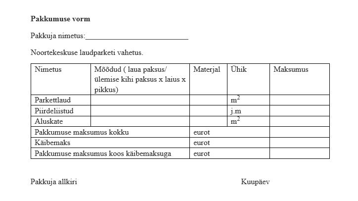 Kohtla Vallavalitsus ootab pakkumusi Järve noortekeskuse laudparketi vahetamiseks.