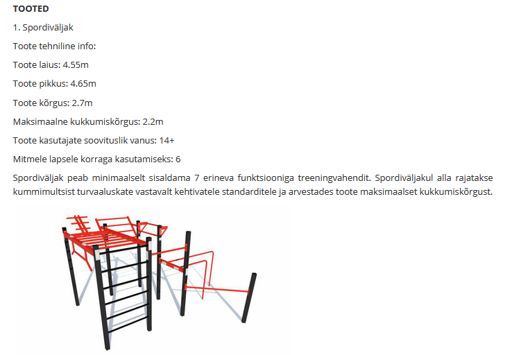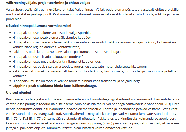 Valga Sport otsib välitreeningväljaku ehitajat Valga linnas. Väljak peab olema püsitatud vastavalt ehitusprojektile, mis koostatakse pakkuja poolt.
