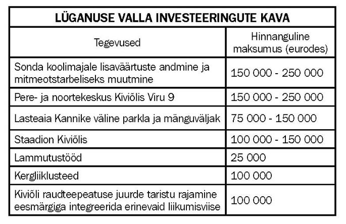 Lüganuse vald sai valitsuselt 530 000 eurot kriisiabi seniste investeeringute toetamiseks. Valla investeeringute kavas on projekte, mis on ettevalmistusega päris kaugel - näiteks Sonda koolimaja muutmine multifunktsionaalseks vabaajakeskuseks. Tulevikus peaks Sonda koolimajja, kus juba praegu tegutseb lasteaed, kolima ka rahvamaja ning noortekeskus.