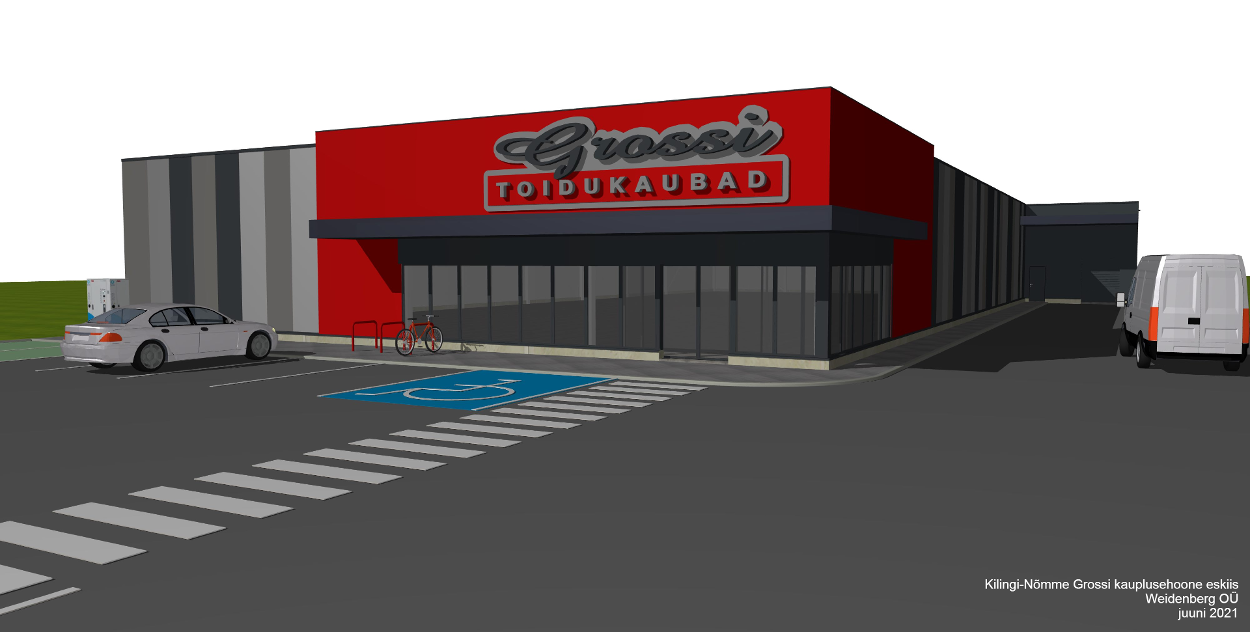 Valminud ja avalikstamisele suunatud kauplusehoone eskiislahendus.